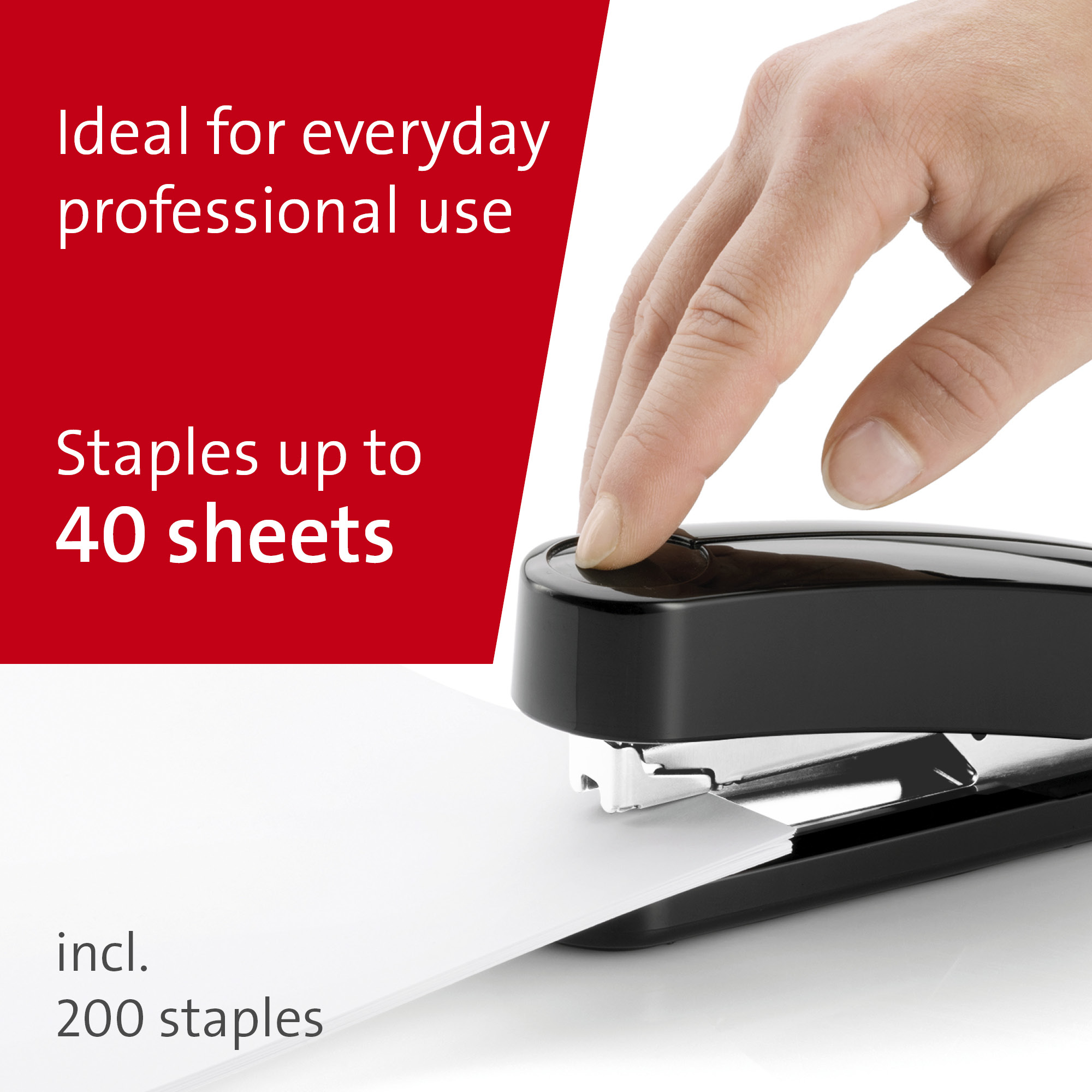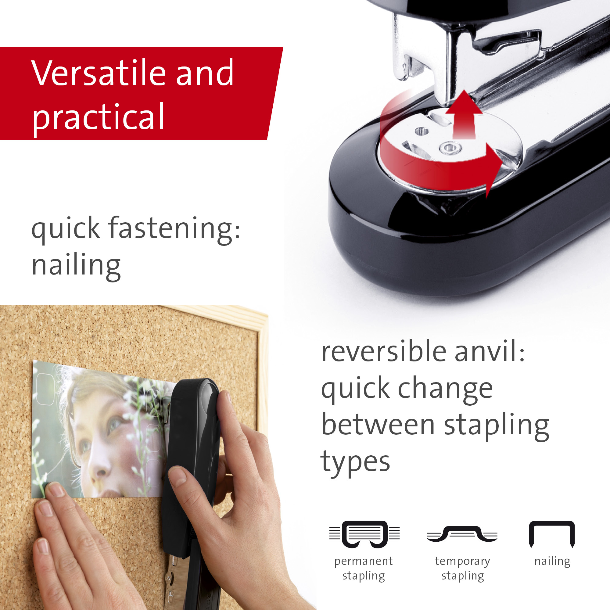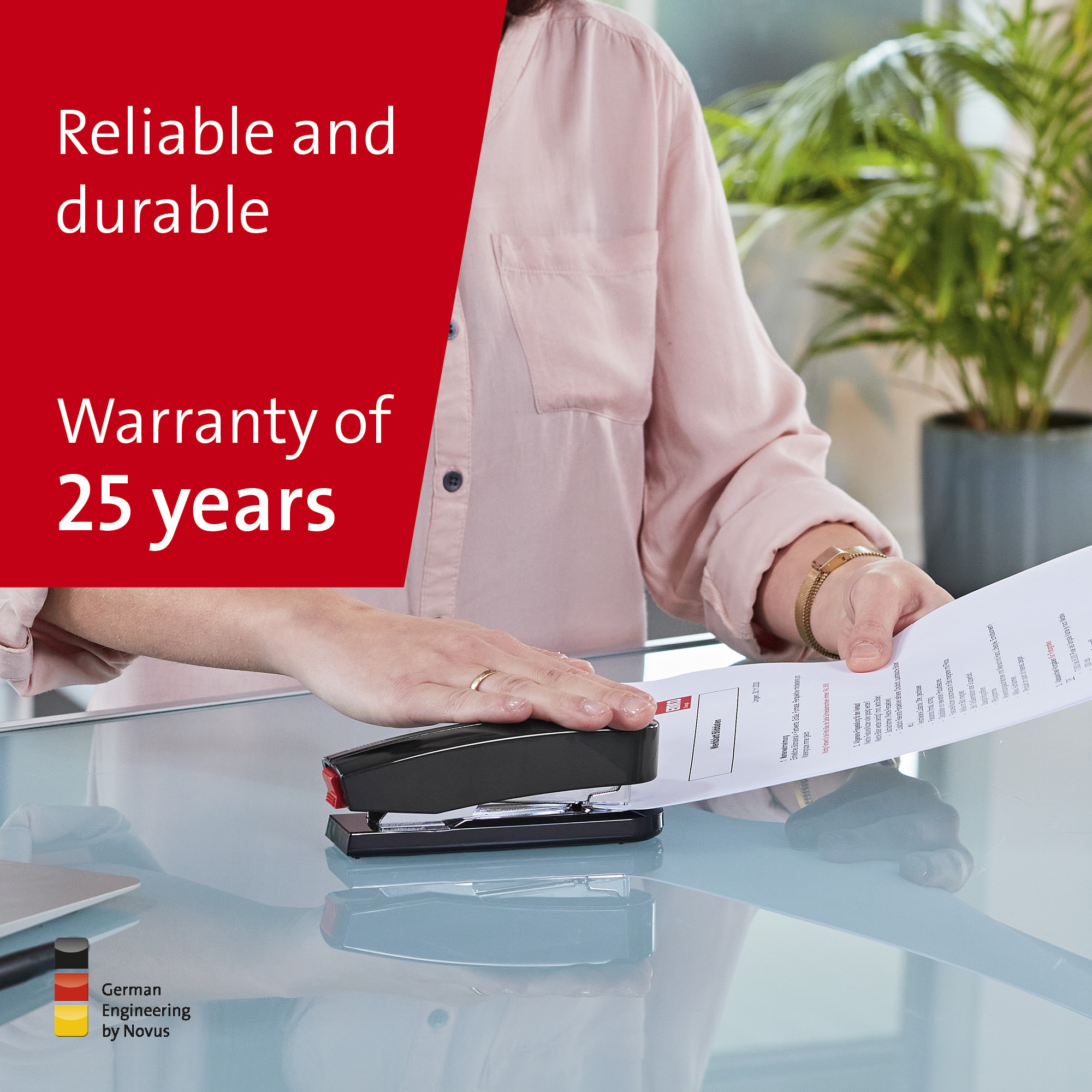Kompaktná vysokovýkonná zošívačka v kovovom prevedení s plastovým vrchným dielom a dvojitým vedením spiniek. Kapacita náplne 100 spiniek 24/6 – 8 alebo 150 spiniek 26/6 – 8. Hĺbka zošívania 6,5 cm. Hmotnosť 245 g. Záruka 25 rokov.