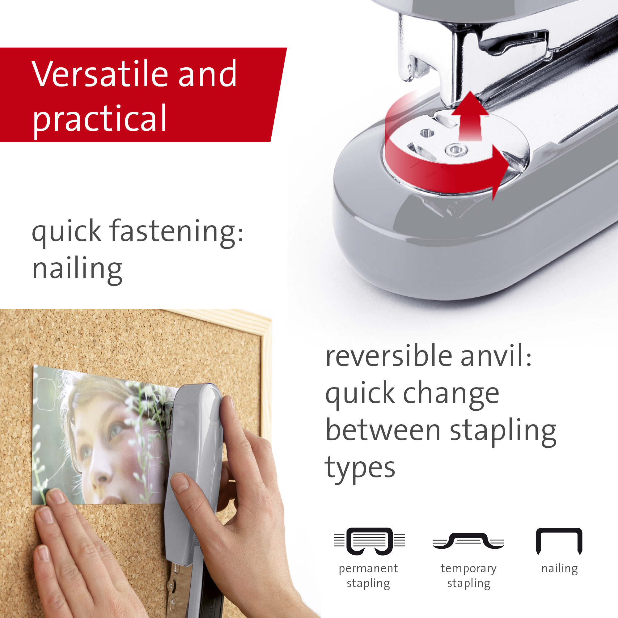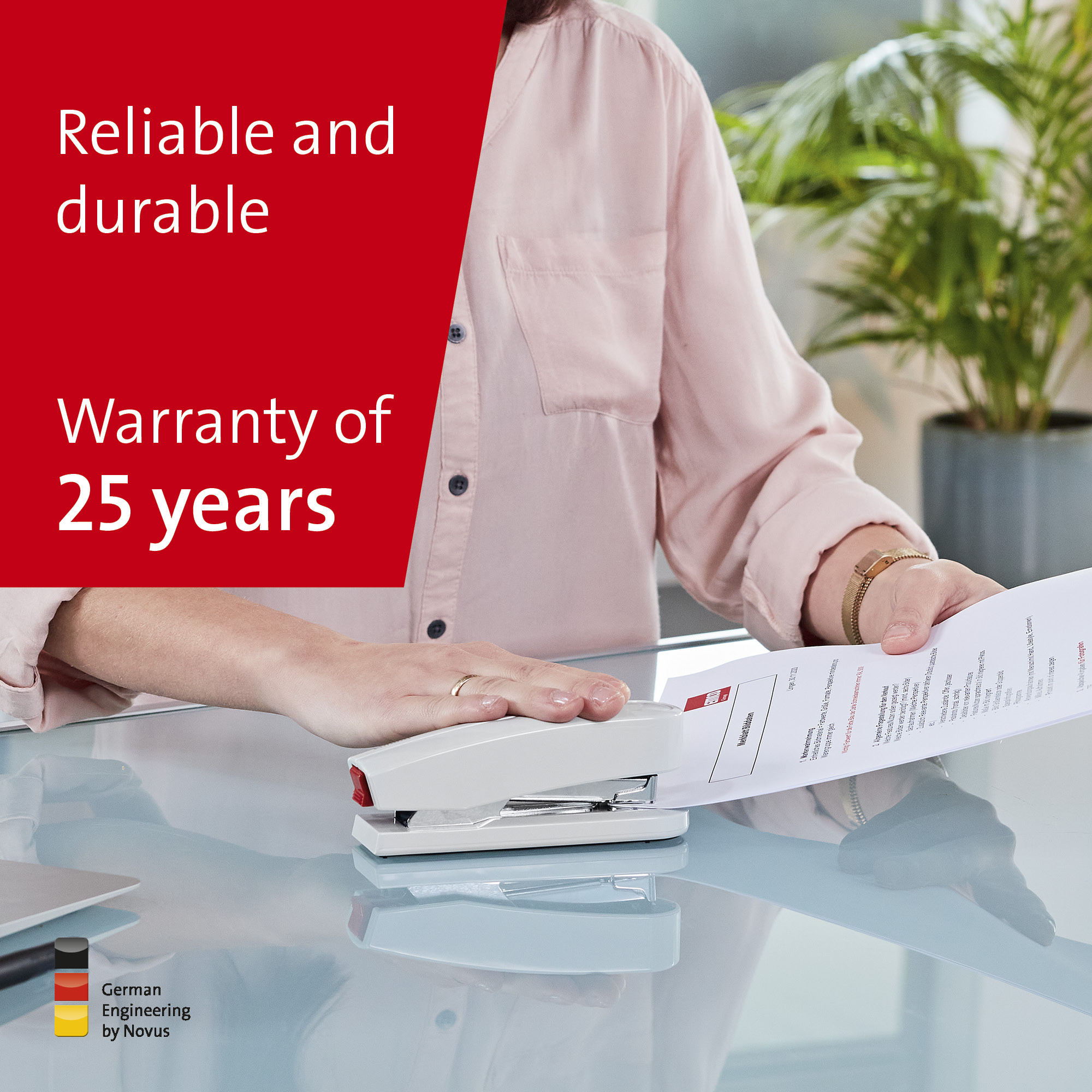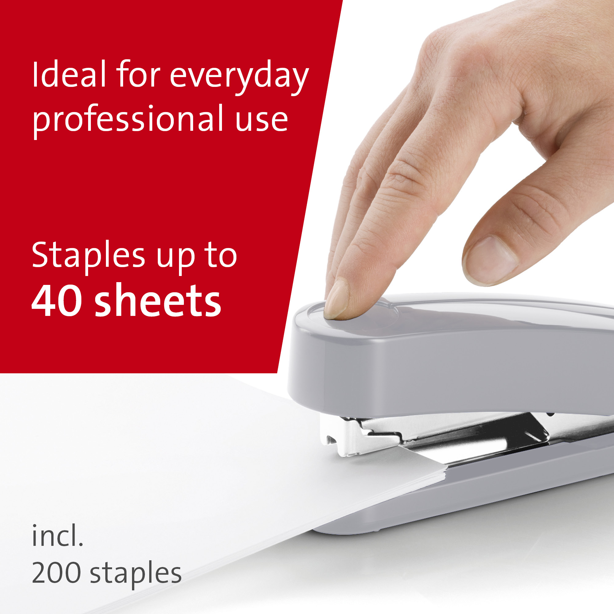 Kompaktná vysokovýkonná zošívačka v kovovom prevedení s plastovým vrchným dielom a dvojitým vedením spiniek. Kapacita náplne 100 spiniek 24/6 – 8 alebo 150 spiniek 26/6 – 8. Hĺbka zošívania 6,5 cm. Hmotnosť 245 g. Záruka 25 rokov.